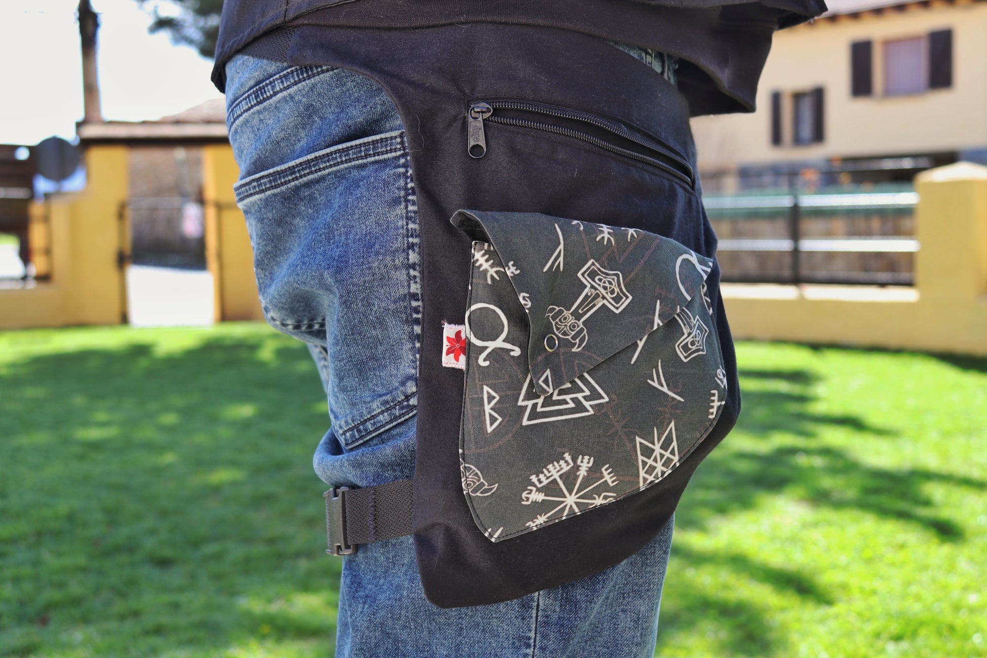 Riñonera con cremallera y bolsillo en el fronal. Lleva una correa ajustable para la pierna. Confeccionado con algodón 100% orgánico.